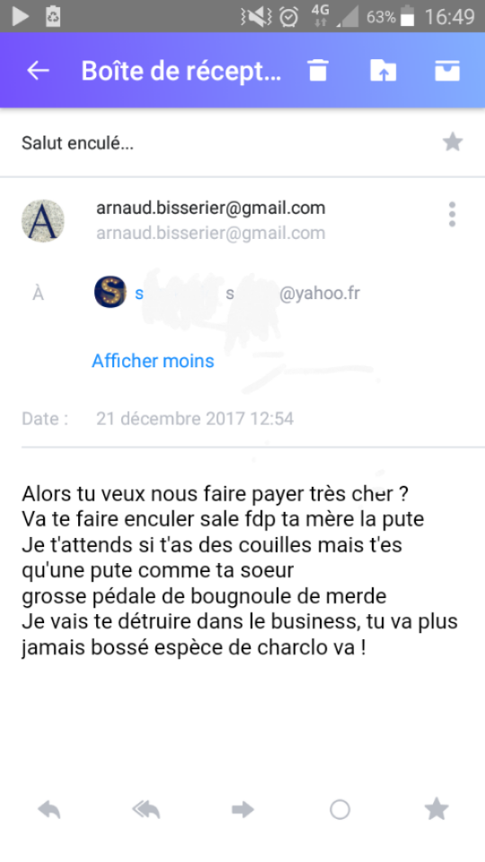 Un ingénieur d’origine maghrébine a reçu depuis l’adresse « arnaud.bisserier@gmail.com », le mail suivant, qui contient des menaces et des injures racistes et homophobes :